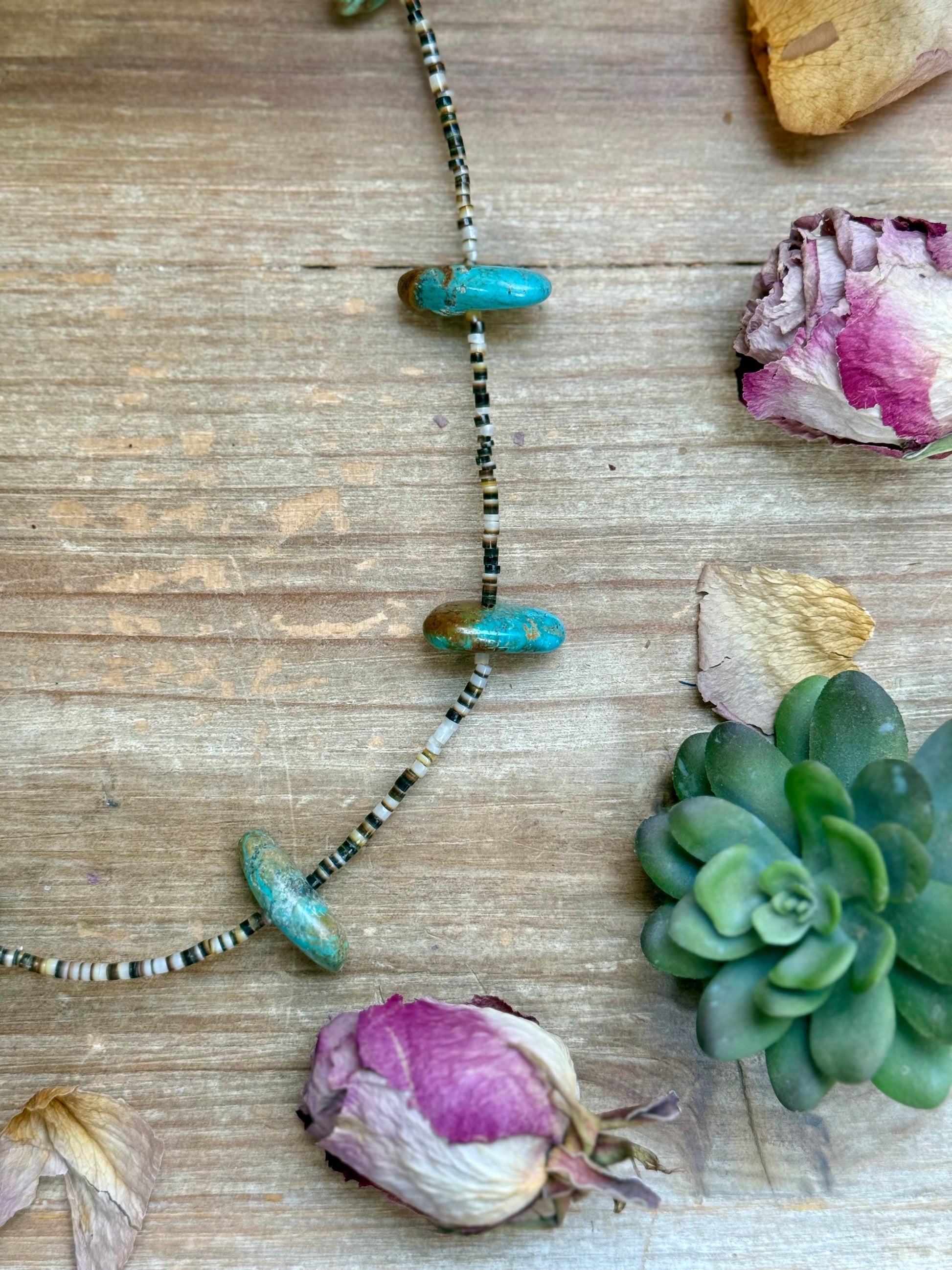 This beautiful 22 inch Chunky Turquoise necklace is handcrafted with natural chunky turquoise stones paired with dark brown shell heishi beads. Finished with a non-tarnish hook for easy and secure wear, each necklace features unique color variations and natural textures, making every piece truly one of a kind.