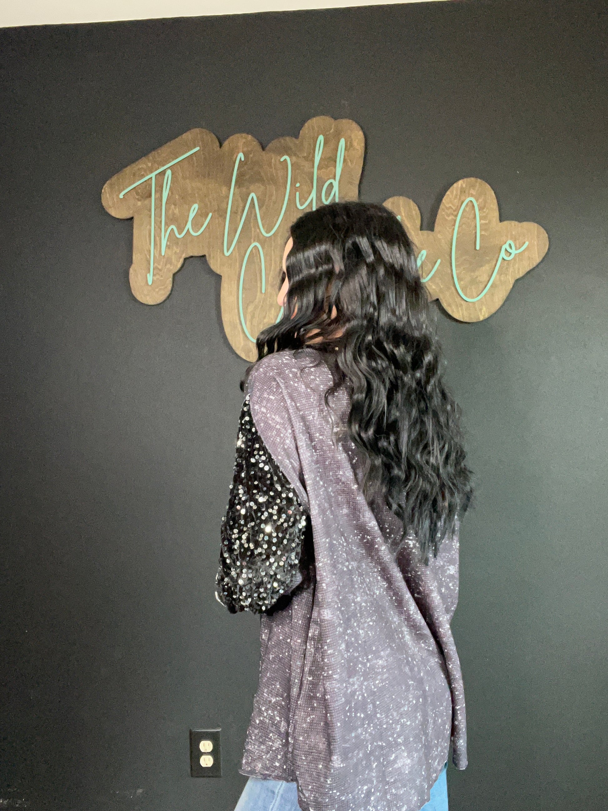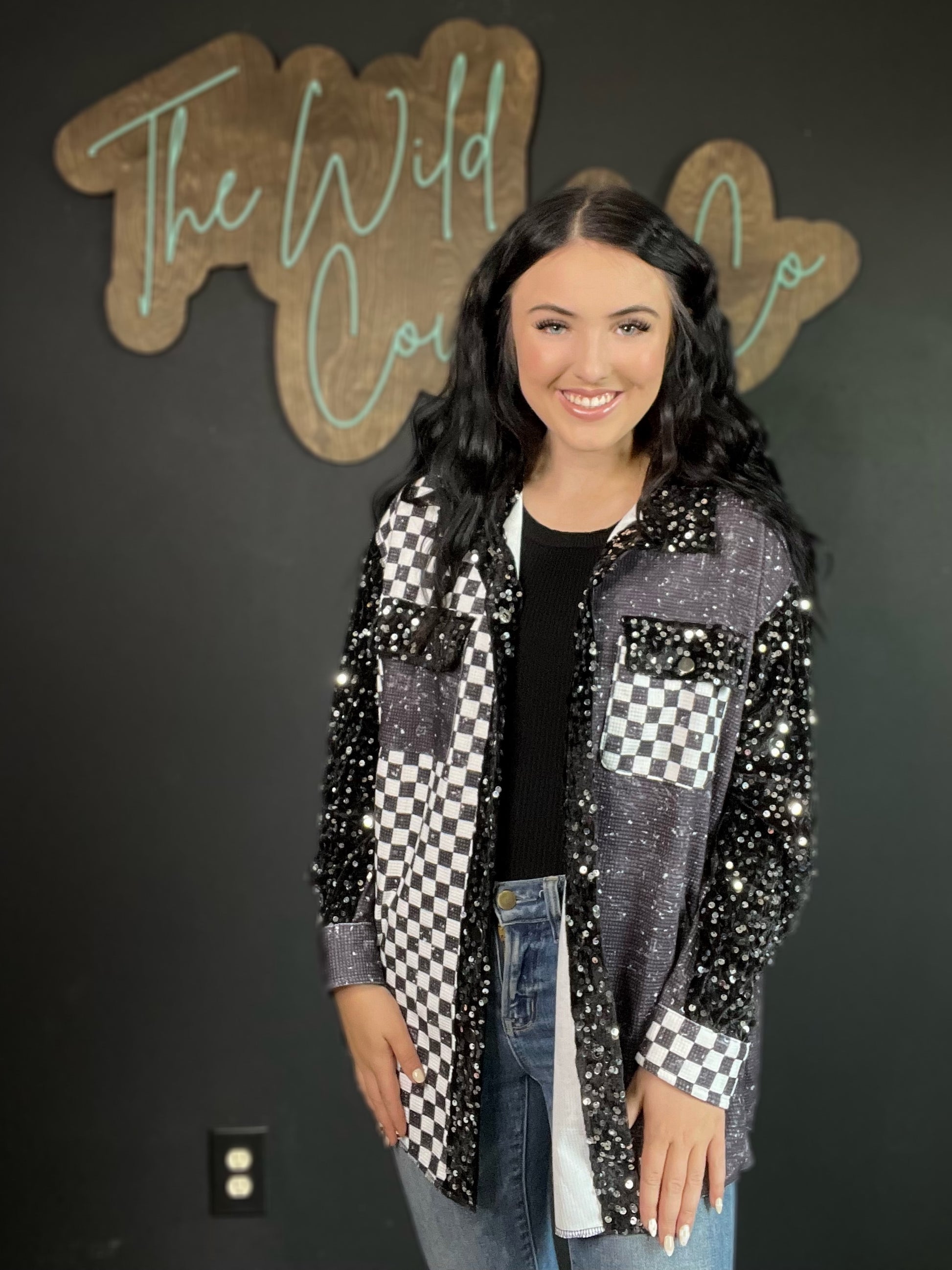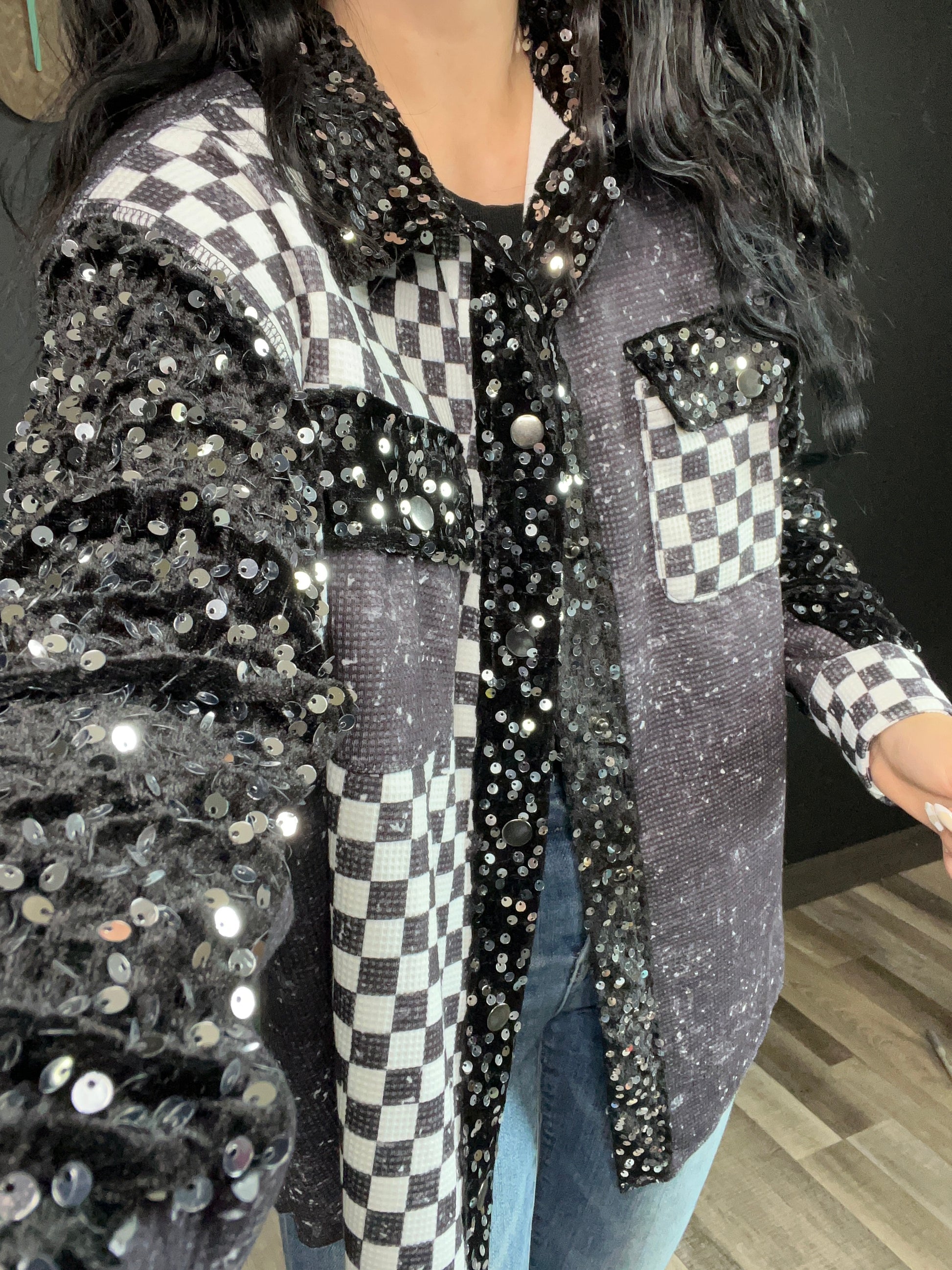 "Unleash your inner fashionista with our Bad and Boujee Shacket. This versatile piece features a bold black and white checkered side and a luxe mineral wash black side, dressed up with velvet sequin arms and collar. A must-have for any trendsetter!" oversized fit