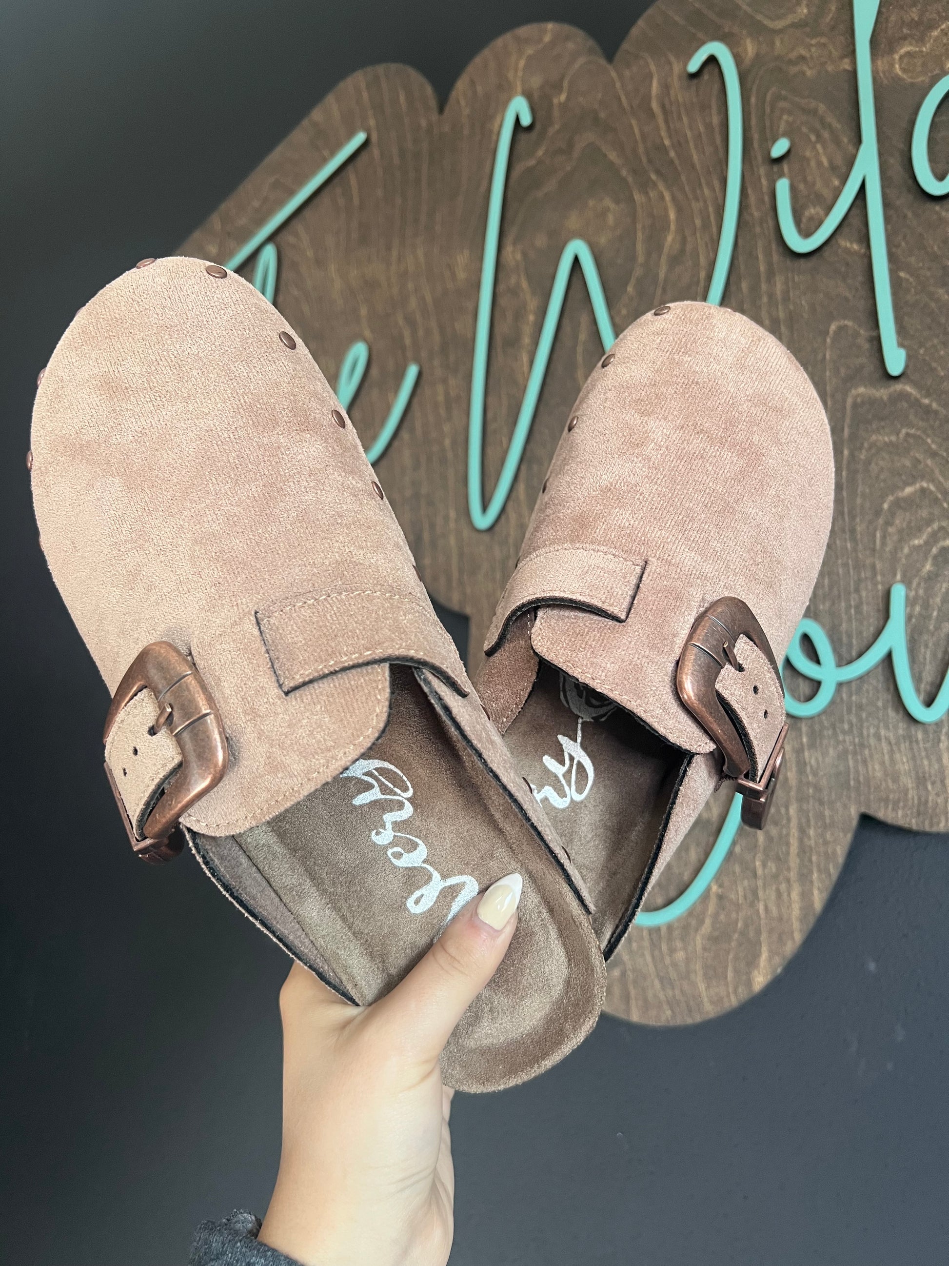 Boston Very G's Women Slip on Mule with faux suede, buckle detail and molded footbed.
