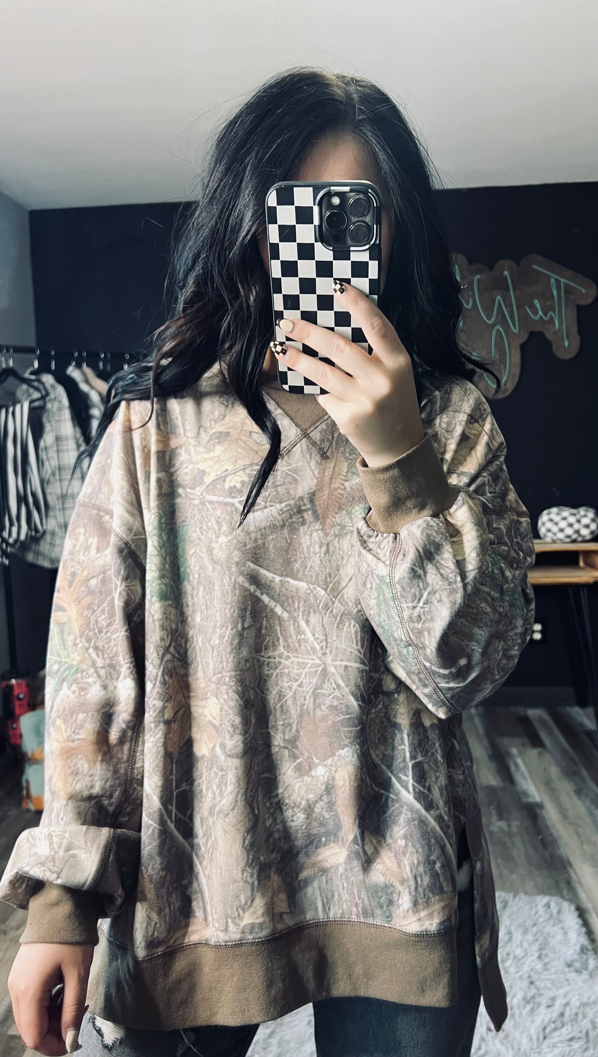 The Camo Crewneck is more of an oversized fit with a thinner material