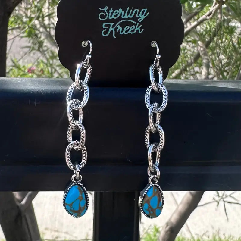 Add a pop of color to your jewelry collection with our Linked In Turquoise Earrings! These cute and fun earrings feature a beautiful turquoise stone and lightweight chain links. Elevate your everyday look with a touch of playfulness. Lenght: 2.25"