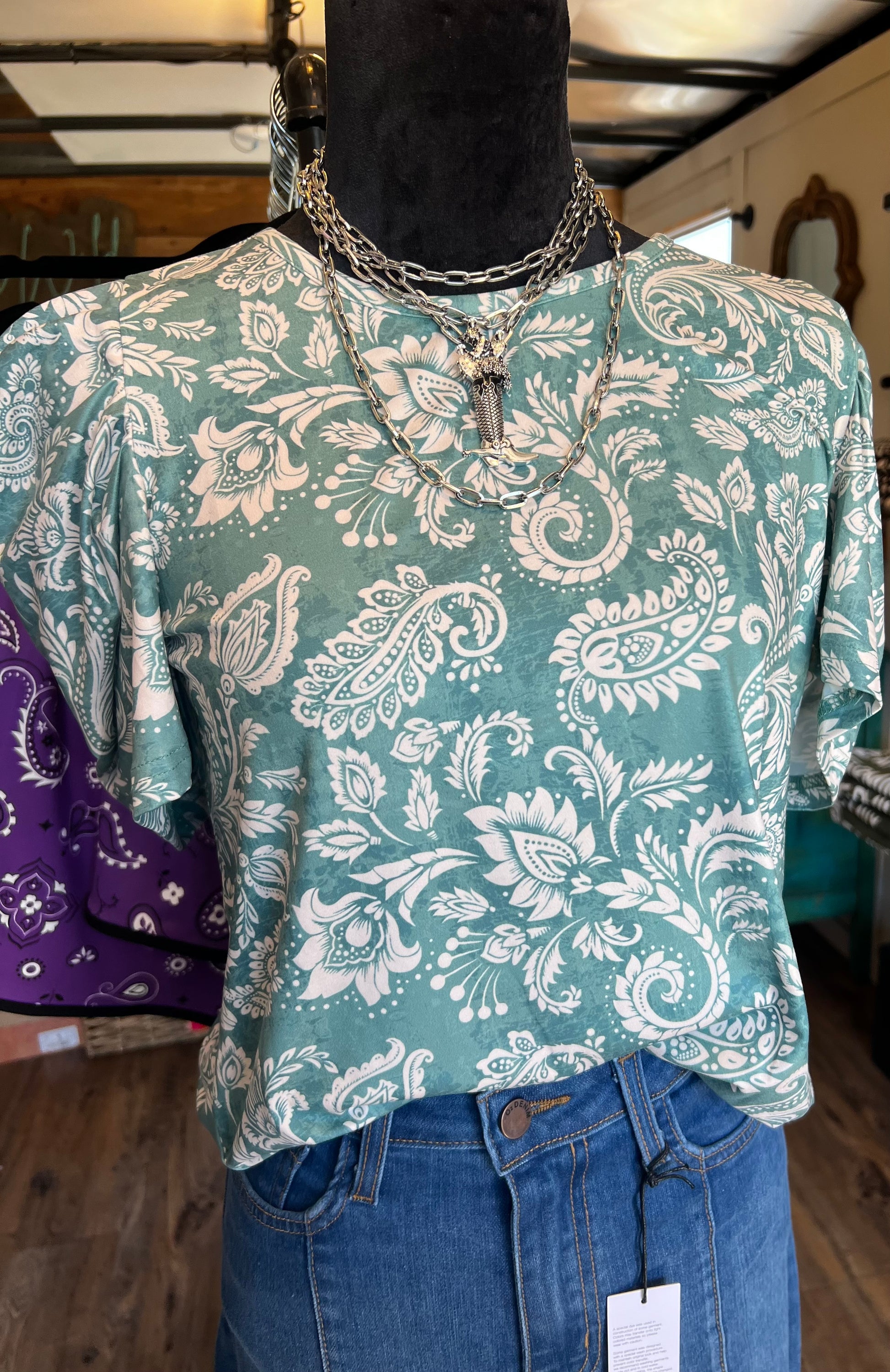 Make a statement with our Perfectly Simple Top. Featuring a cute paisley print, this top is made from buttersoft fabric, ensuring a comfortable and fun wear. The ruffled sleeves add a touch of playfulness to any outfit. Upgrade your wardrobe with this must-have piece!
